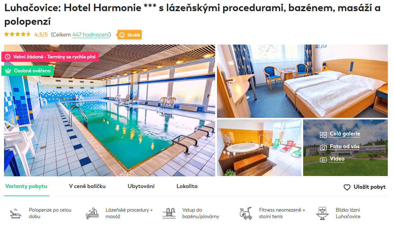 Ne každý touží své volné dny trávit hodinovými túrami, nejlépe co nejvíc aktivně. Patříte-li tedy mezi ty, kteří si rádi odpočnou na masáži či v bazénu, využijte akčních poukazů pro 2 osoby, jejichž cena začíná již na 1710 Kč. Za tuto cenu zakoupíte poukaz na 1 noc s polopenzí, jestliže si však chcete užít procedury v ceně poukazu, můžete si vybrat z alternativ až na 8 dnů. Poté si užijete inhalaci Vincentky či vonný zábal. Poukaz je však nutné využít do konce října.