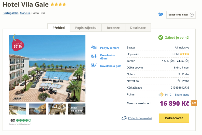 Inspirujte se naším dalším dnešním tipem a navštivte ostrov věčného jara – Madeiru. V nabídce cestovní kanceláře se objevil last minute zájezd na tento ostrov za cenu 16 890 Kč. Cena zájezdu zahrnuje zpáteční letenky z Prahy, letištní transfery v místě pobytu, stravování formou all inclusive, ubytování ve 4* hotelu a služby delegáta. Skvěle hodnocený hotel se nachází nedaleko centra vesničky Santa Cruz a kamenité pláže. Před cestou určitě nakoukněte do našeho online průvodce Madeirou, kde najdete informace o ostrově a tipy na výlety.