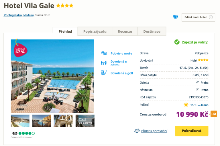 O tomto zájezdu na Madeiru jsme vás již v minulosti informovali a dnes uděláme radost všem, kteří s nákupem do poslední chvíle váhali. Cena za pobyt s polopenzí totiž výrazně klesla, nyní zaplatíte jen 10 990 Kč. Balíček dále zahrnuje ubytování v hotelu na 8 dní, zpáteční letenky z Prahy, letištní transfery a služby delegáta. Termín odletu je již toto úterý, máte tak nejvyšší čas si naplánovat program! Před cestou určitě nakoukněte do našeho online průvodce Madeirou, kde najdete informace o ostrově a tipy na výlety. Před cestou určitě nakoukněte do našeho online průvodce Madeirou, kde najdete informace o ostrově a tipy na výlety.