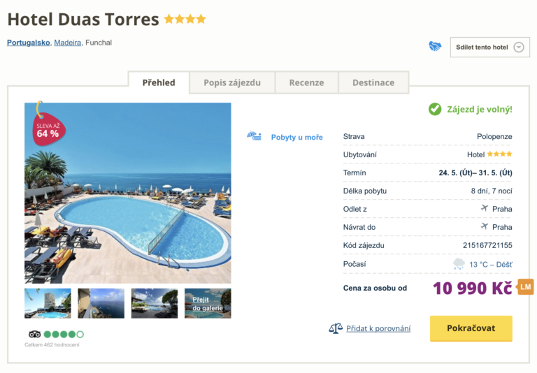 Inspirujte se naším dalším dnešním tipem a navštivte nádhernou Madeiru! Tento ostrov v Atlantiku má vše od krásných pláží, přes útesy až po vysoké hory. Na tuto nezapomenutelnou dovolenou se můžete navíc vydat za parádní cenu 10 990 Kč. Součástí ceny jsou zpáteční letenky z Prahy, letištní transfery v místě, stravování formou polopenze, ubytování ve 4* hotelu a služby delegáta. Před cestou nezapomeňte nakouknout do našeho online průvodce tímto ostrovem.