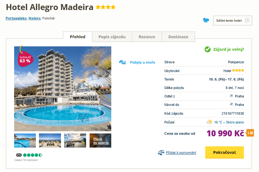 Nedělám vám problém odcestovat na poslední chvíli? Gratulujeme, díky vaší flexibilitě patříte k těm šťastnějším cestovatelům, kteří si mohou vybírat z nabídky výhodných Last Minute pobytů. Jeden takový zde pro vás dnes máme, podívat se můžete na Madeiru a to jen za 10 990 Kč. Balíček cestovní kanceláře zahrnuje ubytování v hotelu s polopenzí na 8 dní, zpáteční letenky z Prahy, letištní transfery a služby delegáta. Tato kombinace je tak vhodná pro všechny, kteří chtějí Madeiru procestovat. S nákupem se příliš nerozmýšlejte, odlétá se již zítra. Inspiraci můžete načerpat v našem podrobném průvodci Madeirou, ve kterém najdete mnoho rad a tipů.