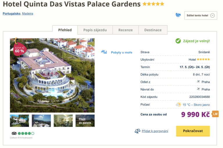 Navštivte krásnou Madeiru! V nabídce cestovní kanceláře se objevil zájezd do 5* hotelu za skvělou cenu 9 990 Kč! Cena zahrnuje zpáteční letenky z Prahy, letištní transfery v místě pobytu, ubytování, snídaně a služby delegáta. Skvěle hodnocený 5* hotel disponuje bazénem a nachází se nedaleko hlavního města Funchal. Na Madeiře se určitě nudit nebudete! Najdete zde krásnou přírodu, hory, mnoho stezek i treků. Před cestou určitě nahlédněte do našeho online průvodce Madeirou, ve kterém najdete tipy na zajímavá místa.