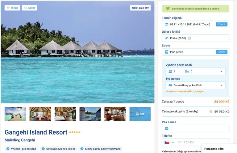 Rádi byste se vydali do exotického ráje? Díky našemu dnešnímu tipu můžete zažít na vlastní kůži Maledivy! Dopřejte si pobyt v 5* hotelu, který se nachází v severním atolu Ari. Ostrov Gangehi je nedotčený ostrov chráněný korálovým útesem, který vás okouzlí nádhernými plážemi s bílým pískem. V ceně 24 990 Kč jsou zahrnuty zpáteční letenky z Prahy, letištní transfery v místě pobytu, stravování formou plné penze, ubytování v 5* hotelu a služby delegáta. S nákupem příliš dlouho neváhejte, odlet je již pozítří 2.11.2021!