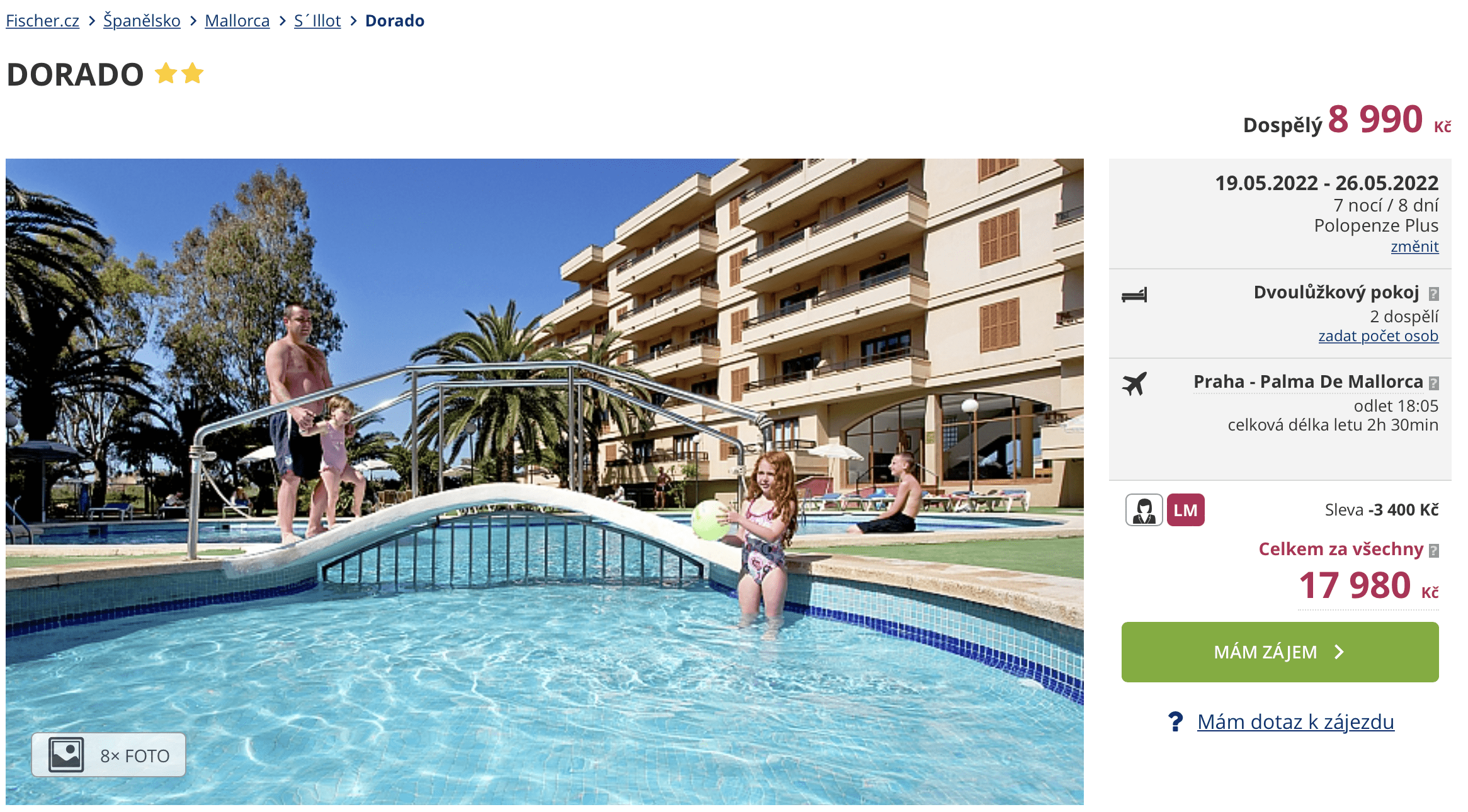 Přemýšlíte, kam v následujících týdnech za odpočinkem? Pokud rádi cestujete s cestovní kanceláří, určitě vás zaujme náš dnešní tip. Za cenu 8 990 Kč se můžete vydat na krásný ostrov Mallorca a užít si skvělou 8denní dovolenou. V ceně jsou zahrnuty zpáteční letenky z Prahy, letištní transfery v místě, stravování formou polopenze, ubytování a služby delegáta. Hotel Dorado se nachází v letovisku S´Illot a leží přibližně 150 metrů od písečné pláže. Před cestou nezapomeňte nahlédnout do našeho online průvodce Mallorcou, kde najdete tipy na výlety a informace o ostrově.