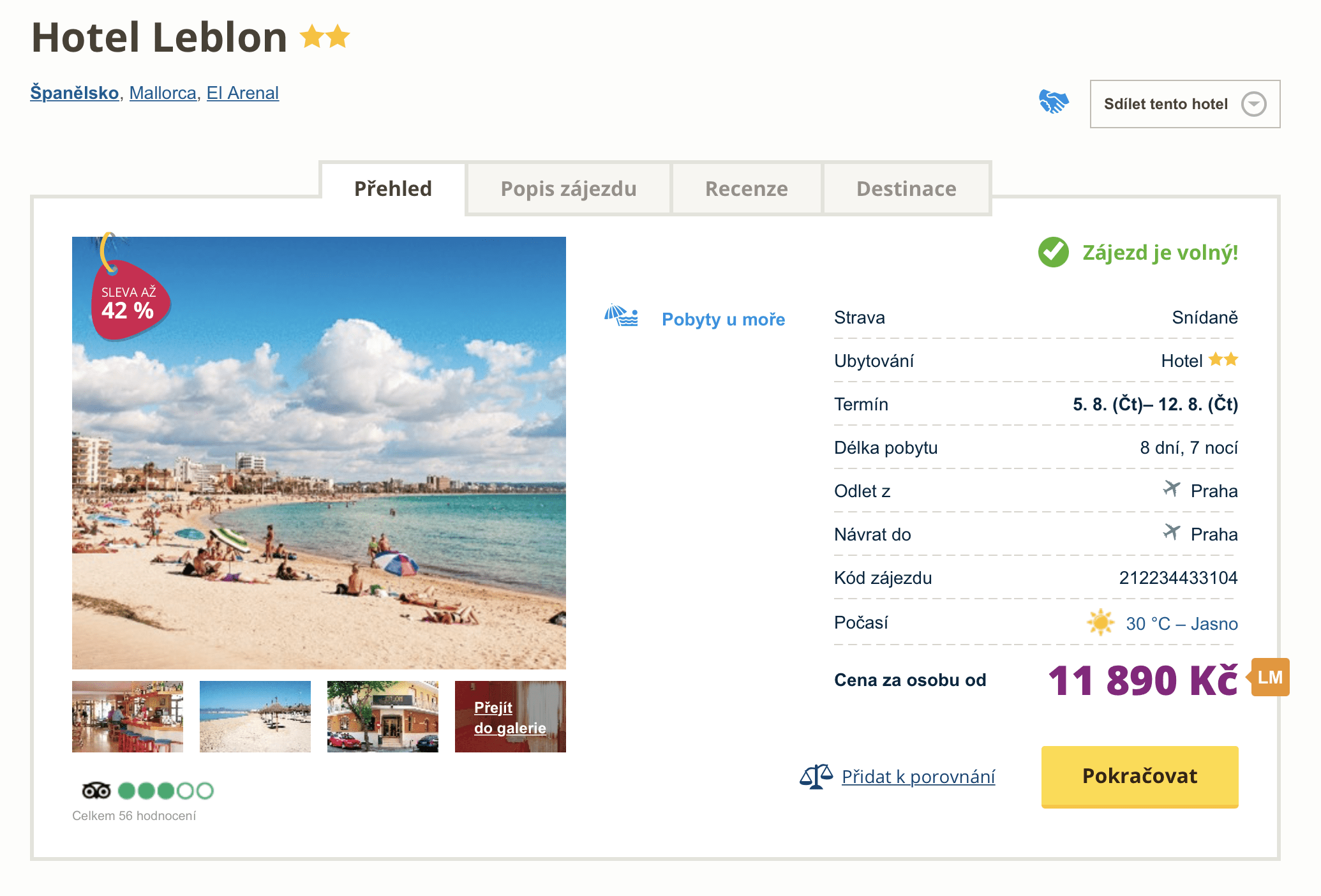 Hledáte dovolenou na poslední chvíli? Už za dva dny si můžete užívat průzračného moře a sluníčka na ostrově Mallorca. Za cenu 11 890 Kč se vám cestovní kancelář postará o letenky z Prahy, letištní transfer, ubytování v hotelu a služby delegáta. V ceně zájezdu je zahrnuto stravování formou snídaně. Hotel Leblon se nachází nedaleko písečné pláže a centra letoviska Playa de Palma. Odlet je již za dva dny, a tak s nákupem příliš dlouho neváhejte. Inspiraci na výlety najdete v našem online průvodci.
