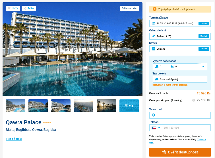 Patříte mezi impulsivní cestovatele, kteří jdou bez dlouhého přemýšlení do akce? Pak právě pro vás máme tip na zájezd s cestovní kanceláří, v kterém zbývá posledních pár volných míst. Již zítra si můžete užívat sluníčka na Maltě, a to navíc za skvělou cenu 13 590 Kč. V balíčku pořídíte ubytování v hotelu se snídaní, zpáteční letenky z Prahy, služby delegáta a letištní transfery. Toto kombo je perfektní pro všechny cestovatele, kteří chtějí ostrov procestovat. V těsné blízkosti hotelu je skalnatá pláž, několik restaurací, barů i obchodů. Před cestou nezapomeňte nahlédnout do našeho online průvodce ostrovem, kde najdete tipy pro váš itinerář.