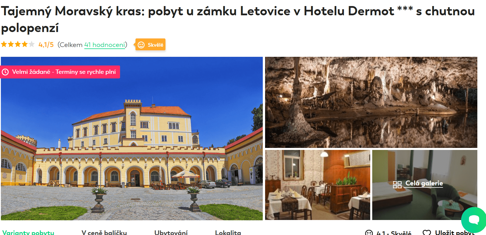 Že jste ještě nebyli v Moravském krasu? Velká chyba! Tato chráněná krajinná oblast nabízí svým návštěvníkům nepřeberné množství kouzelných zákoutí, jeskyní, dech beroucí propast Macochu a mnohé další. Vy si nyní můžete během 3 dnů/2 nocí užít odpočinek v hotelu Dermot *** s polopenzí za pouhých 1999 Kč. Jestliže by vám tři dny nestačily, vyberete si z balíčku na 4 i 5 dní. Voucher pak můžete využít až do konce listopadu.