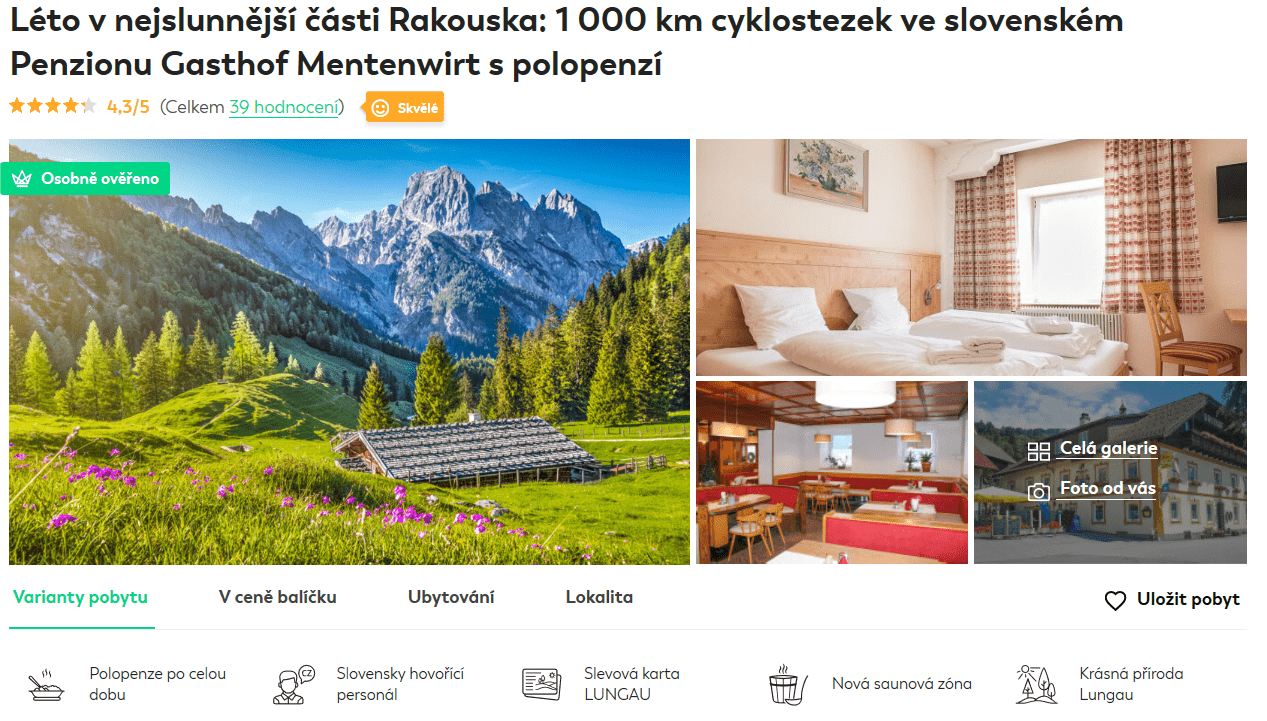 Last minute nabídka nemusí být jen k moři. Klidně stačí vyrazit jen k sousedům! Využijte proto akčního balíčku a vydejte se na 5 dní do rakouského Lungau za 8890 Kč! Tato cena zahrnuje ubytování a polopenzi pro 2 osoby na 5 dní, dále pak i slevovou kartu Lungau. Ubytování budete navíc v krásném slovenském penzionu! Pozor, nabídku za tuto cenu je možné využít jen do konce července! V případě, že byste to do konce července nestíhali, zakoupíte alternativně balíčky až do konce září.