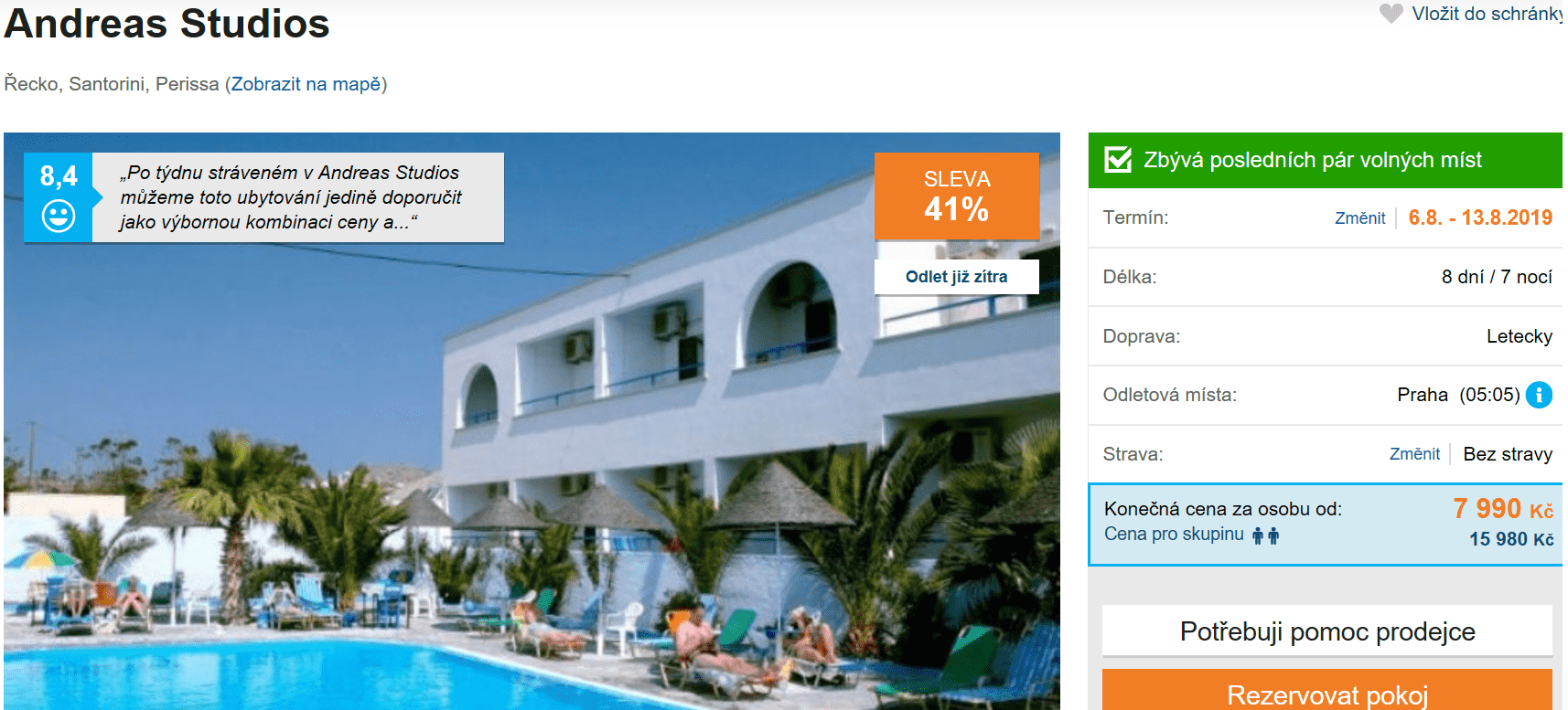 Dobalit poslední věci do kufru a odletět? Jestliže využijete nabídky super last minute zájezdu s cestovní kanceláří na krásné Santorini, tak přesně toto vás čeká. V ceně 7990 Kč máte zpáteční letenku z Prahy, dopravu na místě, služby delegáta a ubytování ve výborně hodnoceném hotelu (na Invii získal 8,4/10) po celých 8 dní! Podrobného průvodce po Santorini zdarma naleznete zde. Jelikož je odlet již zítra v brzkých ranních hodinách, tak s rezervací určitě neotálejte, zbývá jen pár míst!