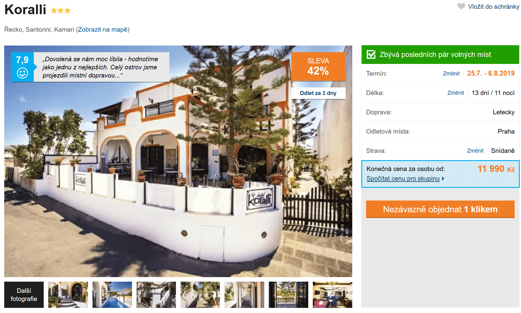 Užijte si dovolenou na malebném ostrově Santorini, kde najdete typické bílé domečky s modrými střechami, a kde se natáčel i slavný film Mamma Mia! Díky této nabídce last minute zájezdu přes cestovní kancelář se na překrásné Santorini podíváte již za skvělých 11990 Kč. V ceně budete mít 13-denní dovolenou, včetně zpáteční letenky z Prahy, dopravy z/na letiště na místě, služby česky mluvícího delegáta, snídaní a dobře hodnoceného ubytování. Před cestou si navíc můžete zcela zdarma přečíst náš podrobný průvodce po Santorini a načerpat v něm inspiraci. Pokud vás zájezd zaujal, s rezervací rozhodně nečekejte. Jde o nabídku last minute a zbývá tak pouze několik posledních míst!