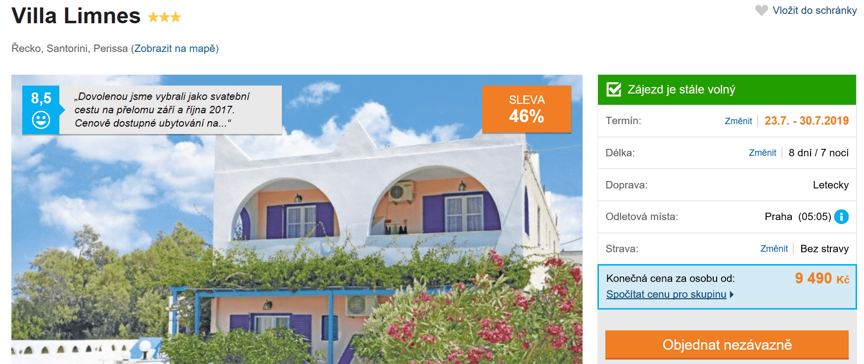 I během hlavní sezony je možné získat zájezd s větším časovým rozestupem za výbornou cenu! Důkazem je aktuální nabídka zájezdu přes cestovní kancelář na krásný řecký ostrov Santorini. V ceně 9490 Kč máte zpáteční letenku z Prahy, dopravu na místě, služby delegáta a ubytování ve skvěle hodnoceném hotelu (na Invii získal 8,5/10). Inspiraci na cestu můžete načerpat v našem podrobném průvodci po Santorini, který je k přečtení zcela zdarma.