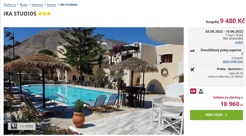 Lákají vás romantické scenerie řeckého ostrova Santorini? Pak by vám mohl udělat radost tip na zájezd s cestovní kanceláří, o kterém jsme vám už říkali. Pobyt ale zlevnil a nově tak zaplatíte jen 9 480 Kč. Cena zahrnuje ubytování na 8 dní, zpáteční letenky z Prahy, letištní transfery a služby delegáta. Pobyt je bez stravy, nic vás tak neomezuje v poznávání ostrova. Určitě nezapomeňte nahlédnout do našeho online průvodce tímto ostrovem, ve kterém najdete informace a tipy na výlety.