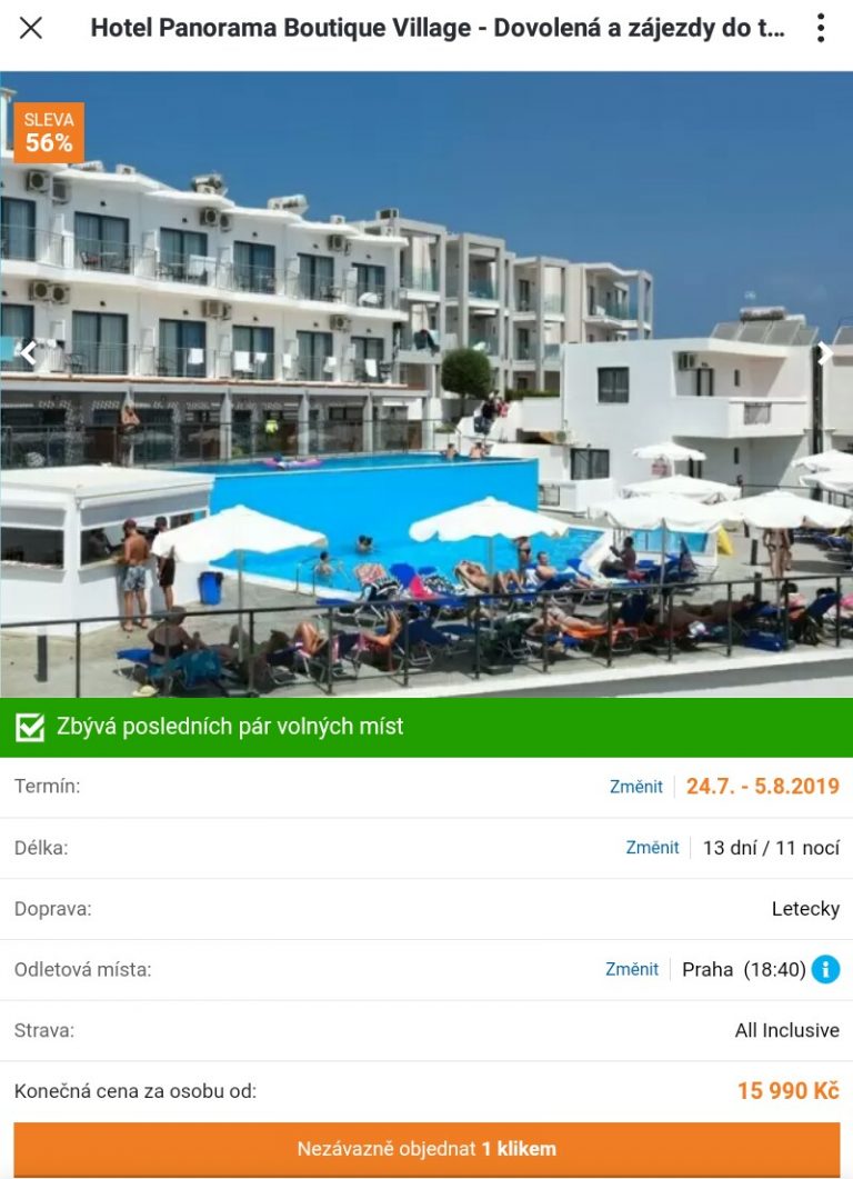 Umíte se sbalit a vypravit za pár hodin? Potřebujete si odpočinout a vyčistit si hlavu ideálně co nejdřív? Tak v tom případě je tato dovolená přímo pro vás. Potřebujete odpočinek jako sůl? V nabídce je nyní super last minute zájezd na Krétu se slevou 56%. Dovolená na 13 dní ve čtyřhvězdičkovém hotelu s all inclusive vás tak vyjde na skvělých 15990 Kč. V ceně navíc budete mít zpáteční letenky s odletem z Prahy, dopravu z/na letiště v cílové destinaci a služby česky mluvícího delegáta. Inspiraci a tipy pro vaši dovolenou najdete v našem podrobném průvodci po Krétě zdarma. V případě, že vás zájezd zaujal, není rozhodně na co čekat. Odlet je již zítra a zbývá několik posledních míst!