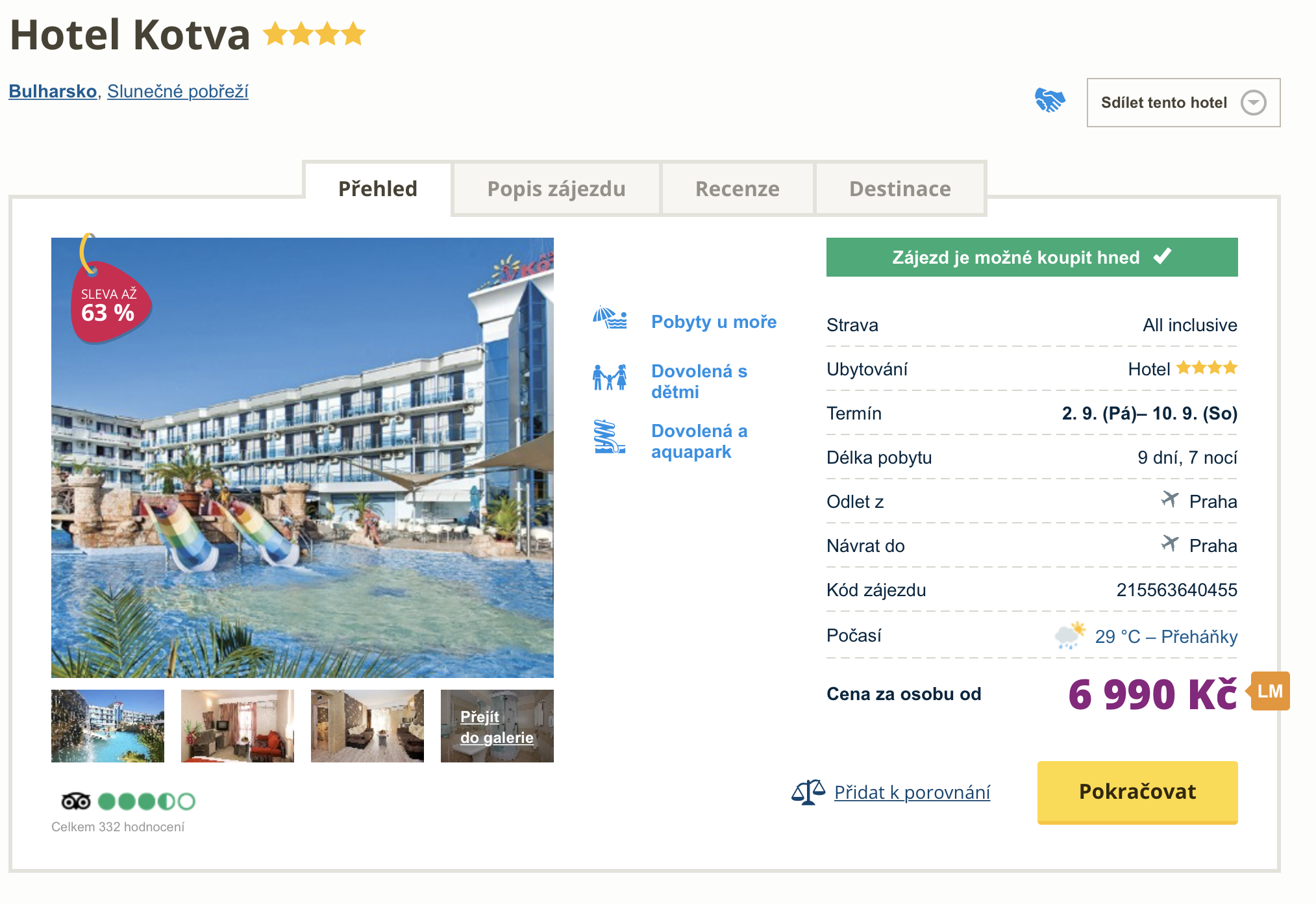Chcete se dnes večer ocitnout u moře? Pokud si dokážete rychle zabalit kufry, máme tip přímo pro vás. Zájezd do 4* hotelu Kotva v bulharském letovisku Slunečné Pobřeží aktuálně pořídíte za cenu 6 990 Kč. Tato cena zahrnuje letenky (odlet z Prahy), letištní transfery v místě, ubytování na 7 nocí, stravování formou all inclusive a služby delegáta. Hotel se nachází 200 metrů od písečné pláže. Před cestou se nezapomeňte inspirovat v našem online průvodci Bulharskem, ve kterém najdete tipy na výlety a informace o jednotlivých letoviscích. S rezervací příliš dlouho neváhejte, odlet je dnes večer.
