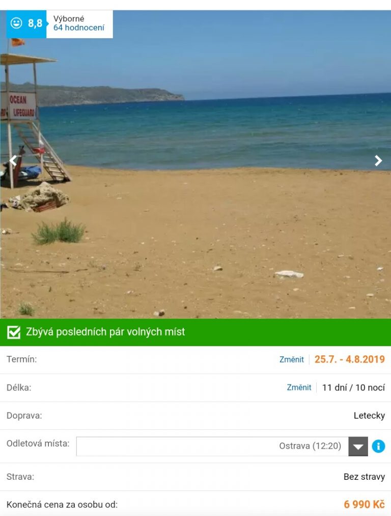 Na trhu se nyní objevila nabídka super last minute zájezdu na Krétu! Pokud tedy pro vás není rychlé balení a vypravování problém, tato dovolená je pro vás ideální. Za krásných 6990 Kč nyní pořídíte dovolenou na překrásném řeckém ostrově na celých 11 dní. V ceně máte zpáteční letenky z Ostravy, transfer z letiště přímo k hotelu, služby česky mluvícího delegáta a skvěle hodnocené ubytování. Tato nabídka je bez stravování. Hotel však leží téměř v centru letoviska Stalos, ve kterém jistě nebude problém najít pěknou tavernu, restauraci, nebo obchod. Pokud vás nabídka zaujala, rozhodně na nic nečekejte. Jde o akci last minute, na kterou zbývá už jen několik míst a odlet je již zítra!! Více tipů a doporučení pro skvělou dovolenou můžete najít zdarma v našem podrobném průvodci po Krétě.