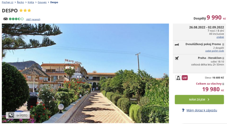 Poohlížíte se na poslední chvíli po výhodném zájezdu? Už zítra se můžete vydat na řeckou Krétu! Zájezd do letoviska Gouves pořídíte za cenu 9 990 Kč. Tato cena zahrnuje letenky (odlet z Prahy), letištní transfery na Krétě, ubytování na 8 dní, all inclusive stravování a služby delegáta. Hotel Despo nabízí klidnou dovolenou v blízkosti písečné pláže. Do centra s tavernami a bary se dostanete krátkou procházkou. Před cestou nezapomeňte nakouknout do našeho podrobného průvodce Krétou, ve kterém najdete rady a tipy na výlety.