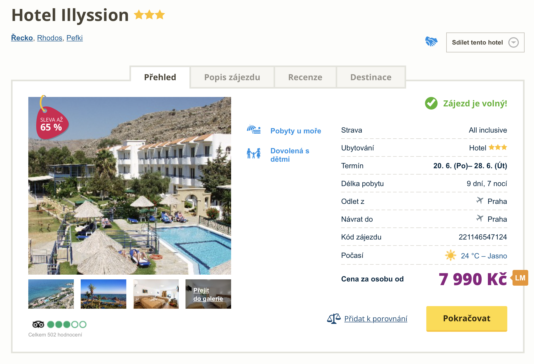 Rádi kupujete dovolenou na poslední chvíli? Přinášíme vám nabídku vhodnou pro spontánní cestovatele s odletem dnes večer. Zájezd na řecký ostrov Rhodos můžete aktuálně pořídit za cenu 7 990 Kč. V této ceně jsou zahrnuty letenky (odlet z Prahy), letištní transfery v místě, ubytování v hotelu na 7 nocí, all inclusive strava a služby delegáta. Hotel je vhodný spíše pro nenáročné cestovatele a nachází v blízkosti pláže a 800 metrů od centra letoviska Pefkos. Před cestou určitě nahlédněte do našeho online průvodce Rhodosem, ve kterém najdete tipy na výlety a informace o ostrově.