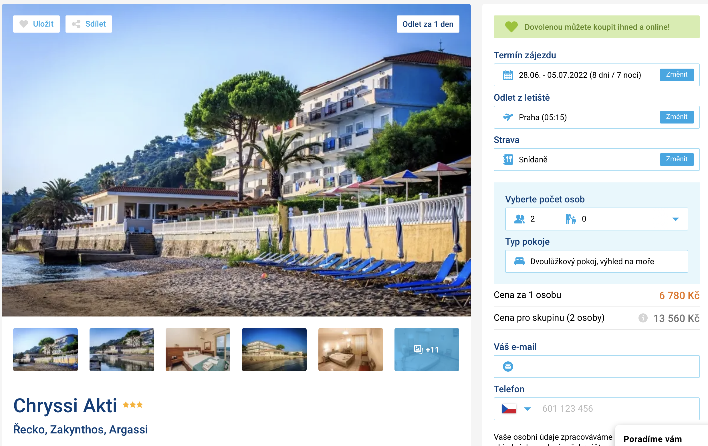 Čeká vás v následujících dnech dovolená? V tom případě věnujte pozornost našemu dalšímu dnešnímu tipu! Za cenu 6 780 Kč se můžete podívat na řecký ostrov Zakynthos. V ceně jsou zahrnuty letenky s odletem z Prahy, letištní transfery v místě, ubytování na 7 nocí, snídaně a služby delegáta. Hotel je ideálním výchozím bodem pro výlety po okolí. Pokud plánujete odpočívat a relaxovat, určitě vás potěší, že písčitá pláž se nachází přímo u hotelu. Rady a tipy na výlety najdete v našem online průvodci Zakynthosem. S rezervací dlouho neváhejte, odlet je již zítra ráno!