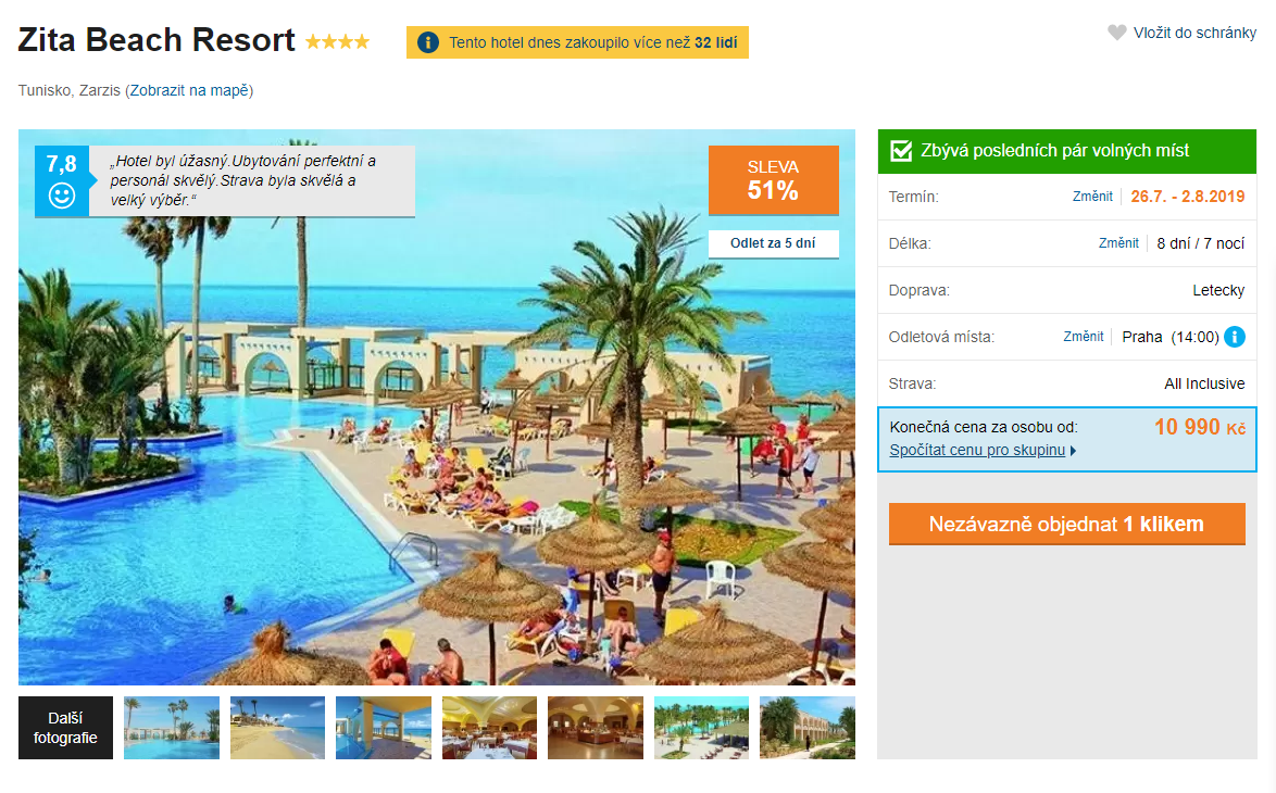 Toužíte po vyhřátém písku, tyrkysovém moři a chladivém drinku ve svých rukách? Pokud je vaše odpověď ano, tak pro vás máme zajímavou nabídku. Tento zájezd, který je zlevněný o 51%, vás vezme na osm dní do Tuniska. Ubytováni budete v hotelovém komplexu, který je obklopený zelenou zahradou s bungalovy. Hned vedle se nachází nádherná písečná pláž, která se vhodná pro děti i seniory. Stravování budete mít zajištěno velmi příjemnou formou – all inclusive! Za částku 10990 Kč získáte kompletní dovolenou – zpáteční letenky s odletem z Prahy, dopravu z letiště do vašeho hotelu a zpět, služby delegáta, ubytování a stravování. Pokud vás tento zájezd zaujal, tak příliš dlouho neotálejte, místa rychle mizí!