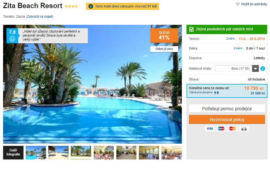 Tunisko patří k velmi vyhledávaným turistickým destinacím. Tento výrazně zlevněný zájezd vás vezme do hotelu Zita Beach Resort, který nabízí nespočet možností, jak si užít vaši dovolenou. Hned vedle něj se nachází každodenně čištěná písečná pláž, který se postupně svažuje až do neuvěřitelně průzračné vody. Stravování budete mít zajištěno formou all inclusive. Za částku 10 790 Kč získáte kompletní dovolenou – zpáteční letenky s odletem z Brna či Ostravy, dopravu z letiště do vašeho hotelu a zpět, služby delegáta, ubytování a stravu. Pokud vás tento zájezd zaujal, tak příliš dlouho neotálejte, místa rychle mizí!