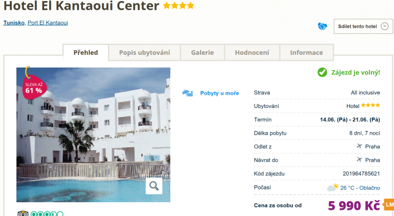Po celých 8 dní si můžete užívat bezstarostné dovolené v sluncem prohřátém Tunisku, kde se uvelebíte na krásných plážích a poznáte kulturu této exotické země. Za last minute nabídku cestovní kanceláře nyní zaplatíte pouhých 5990 Kč a v této ceně budete mít kompletní dovolenou – zpáteční letenku z Prahy, dopravu na místě, služby delegáta, ubytování a stravování formou All Inclusive. Jestliže byste měli o zájezd zájem, s rezervací určitě neváhejte!