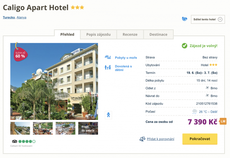 Objevte Turecko! Zemi, kde se střetávají dvě odlišné kultury a tvoří tak unikátní atmosféru. Pokud využijete této nabídky cestovní kanceláře, v Turecku strávíte 15 dní (19.6. – 3.7. 2021). Během této doby budete mít spoustu času na odpočinek i poznávání. V Turecku si na své přijde zkrátka každý! Cena 7 390 Kč zahrnuje letenky, letištní transfer, ubytování a služby delegáta. Odlet je možný z Brna. Informace o Turecku a zajímavých místech si můžete přečíst v našem online průvodci.