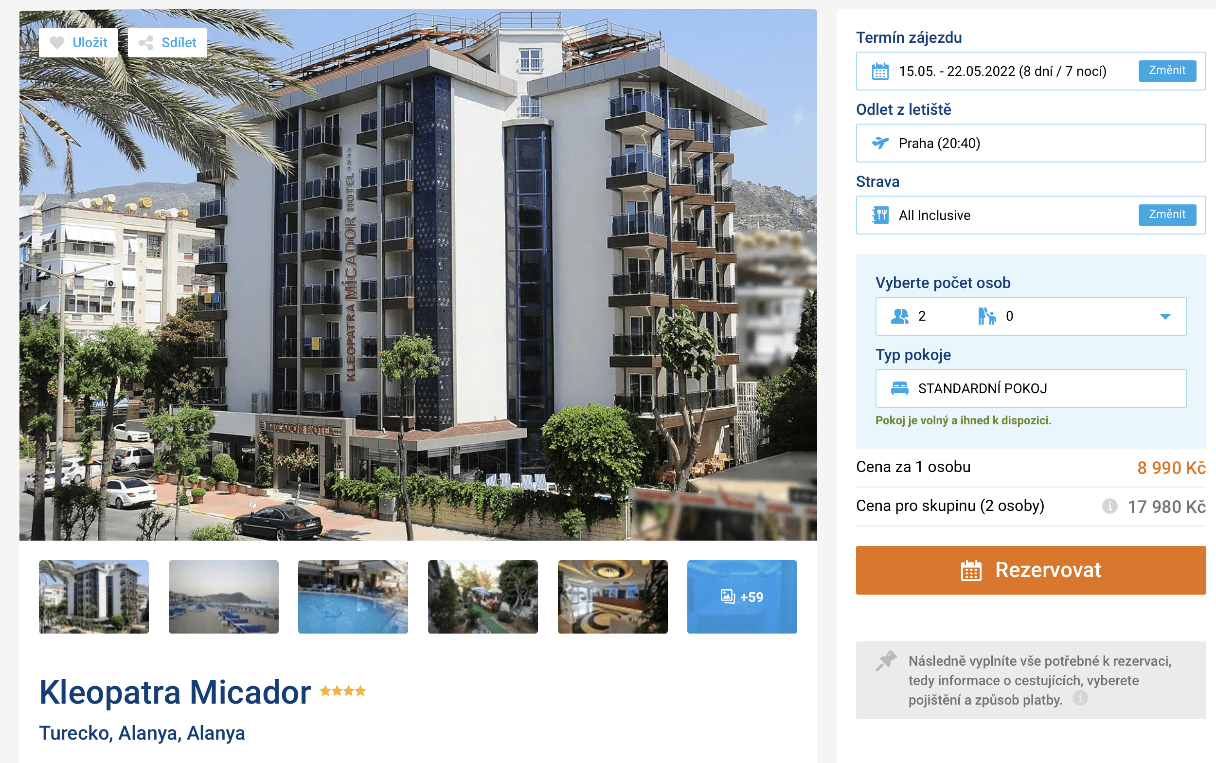 Vydejte se za zaslouženým odpočinkem do tureckého letoviska Alanya! V nabídce cestovní kanceláře se objevil last minute zájezd do 4* hotelu za cenu 8 990 Kč. Cena zájezdu zahrnuje zpáteční letenky z Prahy, letištní transfery v místě pobytu, ubytování na 7 nocí, stravování formou all inclusive a služby delegáta. Před cestou nezapomeňte nahlédnout do našeho online průvodce Tureckem, kde najdete tipy na výlety a informace o jednotlivých letoviscích. Výborně hodnocený hotel Kleopatra Micador se nachází co by dohodil od písečné pláže. Zájezd se koná v termínu 15.5. – 22.5. 2022