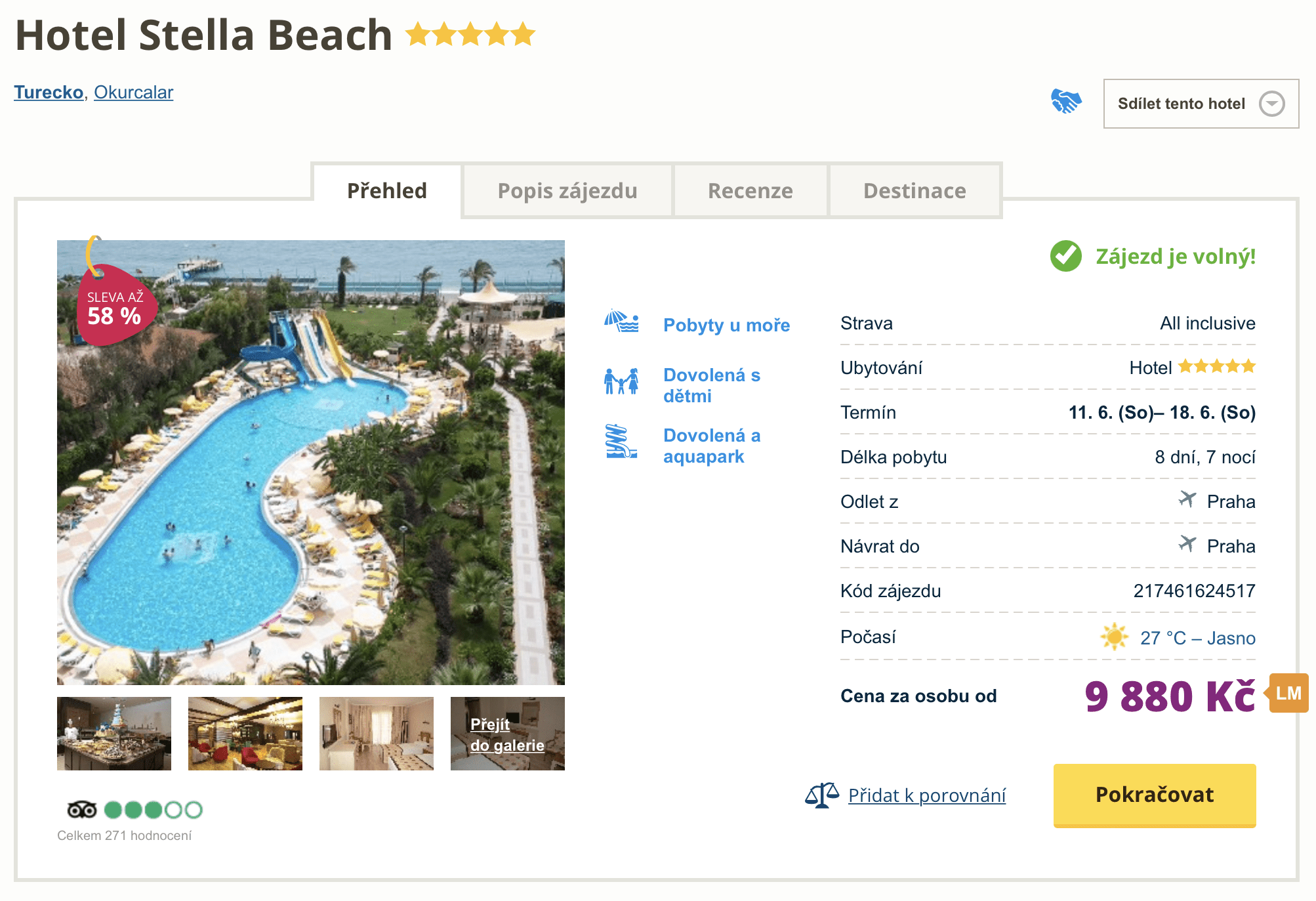 Poohlížíte se po zájezdu s odletem v následujících dnech? Inspirujte se naším dalším dnešním tipem, se kterým můžete zamířit do 5* hotelu v Turecku. Výborně hodnocený hotel leží v klidnější části oblíbeného tureckého letoviska Alanya, přímo u písčito-oblázkové pláže. Zájezd můžete aktuálně pořídit za cenu 9 880 Kč. V této ceně jsou zahrnuty letenky (odlet z Prahy), letištní transfery v místě, ubytování na 7 nocí, stravování formou all inclusive a služby delegáta.Před cestou se nezapomeňte inspirovat v našem online průvodci Tureckem, ve kterém najdete tipy na výlety a informace o zemi.