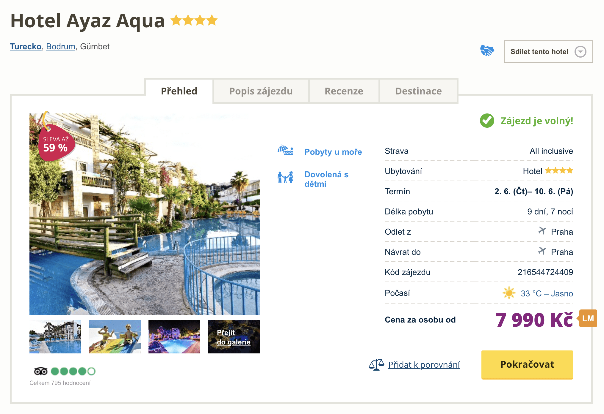 Máte už sbaleno a plánujete dovolenou na poslední chvíli? Dovolenou v tureckém letovisku Bodrum můžete aktuálně pořídit za parádní cenu 7 990 Kč. Za tuto cenu se vám CK postará o kompletní dovolenou a vy si můžete dopřát zasloužený relax. V ceně je zahrnuta zpáteční letenka z Prahy, letištní transfery v místě, ubytování ve 4* hotelu, all inclusive strava a služby delegáta. Před cestou nezapomeňte nahlédnout do našeho online průvodce Tureckem, ve kterém najdete tipy na výlety a informace o jednotlivých letoviscích.