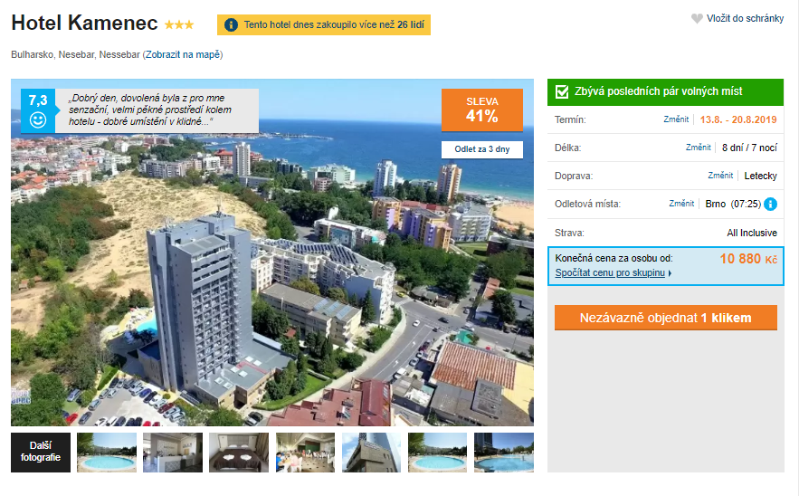 Pokud stále nemáte vybranou svoji letní dovolenou a čekáte na ten pravý zájezd, tak pro vás máme zajímavou nabídku. Tento výrazně zlevněný zájezd vás vezme na osm nezapomenutelných dní do vyhlášeného letoviska Nesebar. Ubytováni bude v příjemném hotelu, který je jen necelých 100 metrů od krásné pláže. Stravování budete mít zajištěno velmi příjemnou formou all incusive. Za částku 10 880 Kč získáte kompletní dovolenou – zpáteční letenky s odletem z Brna, dopravu z letiště do vašeho hotelu a zpět, služby delegáta, ubytování a stravování. Pokud vás tento zájezd zaujal, tak příliš dlouho neotálejte, místa rychle mizí! Inspiraci na cestu můžete načerpat v našem podrobném průvodci po Bulharsku, který je k přečtení zcela zdarma.