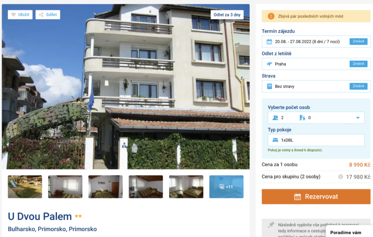 Rádi byste v závěru prázdnin vyrazili k moři? Zájezd do výborně hodnoceného penzionu v bulharském letovisku Primorsko aktuálně pořídíte za cenu 8 990 Kč. V této ceně jsou zahrnuty letenky, letištní transfery v místě, ubytování na 7 nocí a služby delegáta. Odlet je možný z Prahy, Brna nebo Pardubic. Penzion se nachází 10 minut chůze od pláže a centra letoviska. Před cestou se můžete inspirovat v našem online průvodci Bulharskem, ve kterém najdete tipy na výlety a informace o jednotlivých letoviscích.