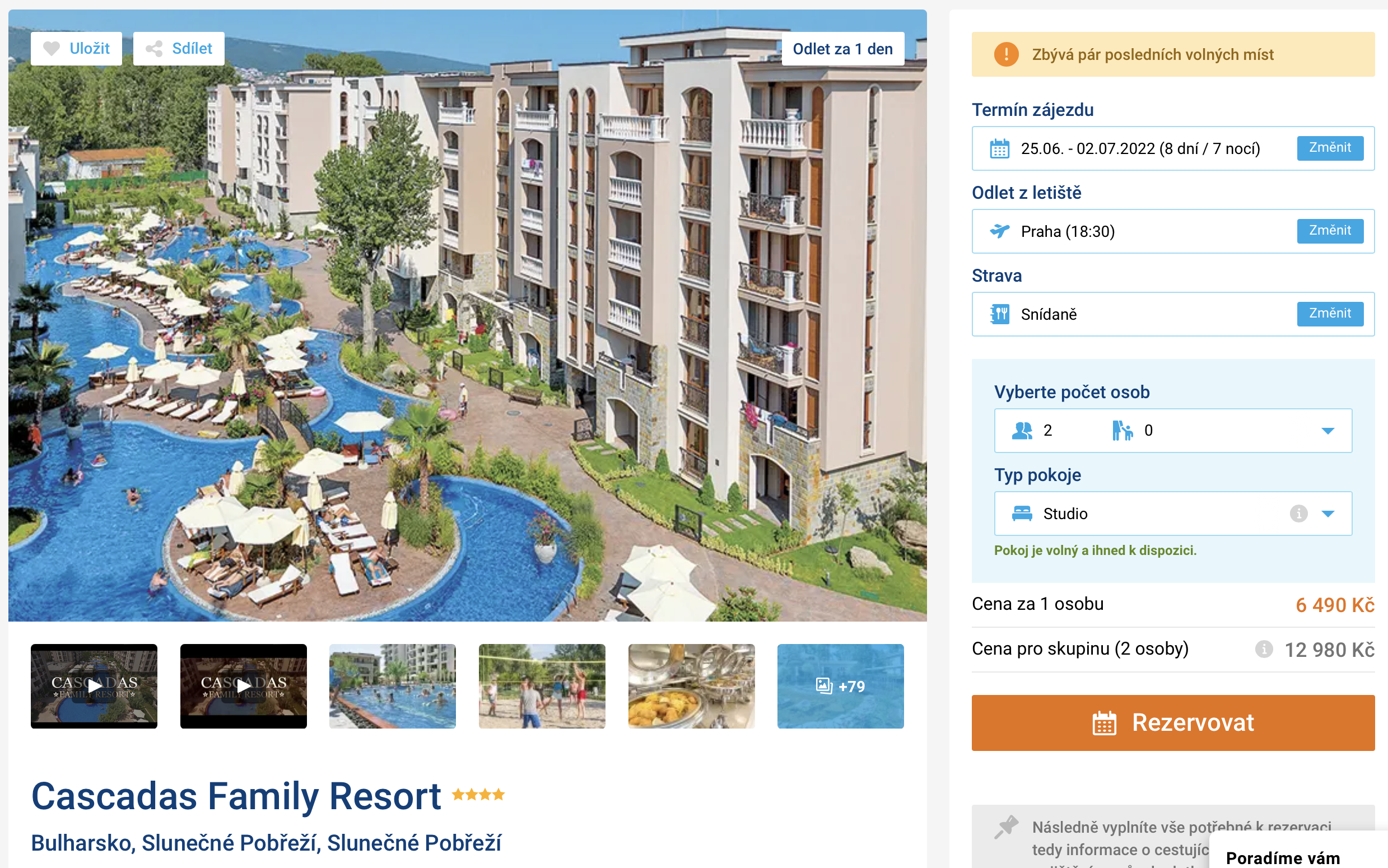Máte už sbaleno a vyčkáváte na vhodný zájezd? Díky našemu dalšímu dnešnímu tipu se můžete už zítra vydat do Bulharska. Zájezd do bulharského letoviska Slunečné pobřeží můžete aktuálně pořídit za cenu 6 490 Kč. Tato cena zahrnuje letenky (s odletem z Prahy), letištní transfery v místě, ubytování v hotelu, snídaně a služby delegáta.Hotel Cascadas Family Resort se nachází nedaleko písčité pláže i centra letoviska. Komplex se skládá z několika budov a nabízí 9 bazénů, bazény pro děti, skluzavky i dva malé aquaparky. Před cestou se určitě inspirujte v našem online průvodci Bulharskem.