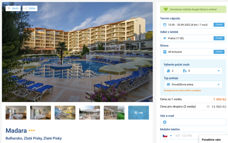 Nechcete nic ponechat náhodě a rádi dovolenou řešíte v předstihu? Inspirujte se naším tipem na zájezd do bulharského letoviska Zlaté Písky. Za cenu 7 490 Kč vám cestovní kancelář zařídí kompletní dovolenou a vy si můžete dopřát zasloužený odpočinek. V ceně jsou zahrnuty letenky (odlet z Prahy), letištní transfery v místě, ubytování na 7 nocí, stravování formou all inclusive a služby delegáta. Výborně hodnocený hotel se nachází v klidné části letoviska. Na pláž se dostanete procházkou skrze centrum. Před cestou se nezapomeňte inspirovat v našem online průvodci Bulharskem, ve kterém najdete tipy na výlety a informace o jednotlivých letoviscích.