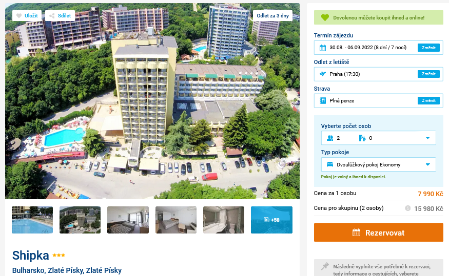 Dnes vás budeme lákat na zájezd s cestovní kanceláří do Bulharska, který si můžete užít již koncem srpna. Cena 7 990 Kč zahrnuje ubytování v hotelu na 8 dní, plnou penzi, zpáteční letenky s odletem z Prahy, letištní transfery a služby delegáta. Hotel Shipka se nachází v destinaci Zlaté Písky a je vzdálen pouhých 200m od písečné pláže. Před cestou nezapomeňte nakouknout do našeho online průvodce Bulharskem, ve kterém najdete informace o jednotlivých letoviscích a tipy na výlety.