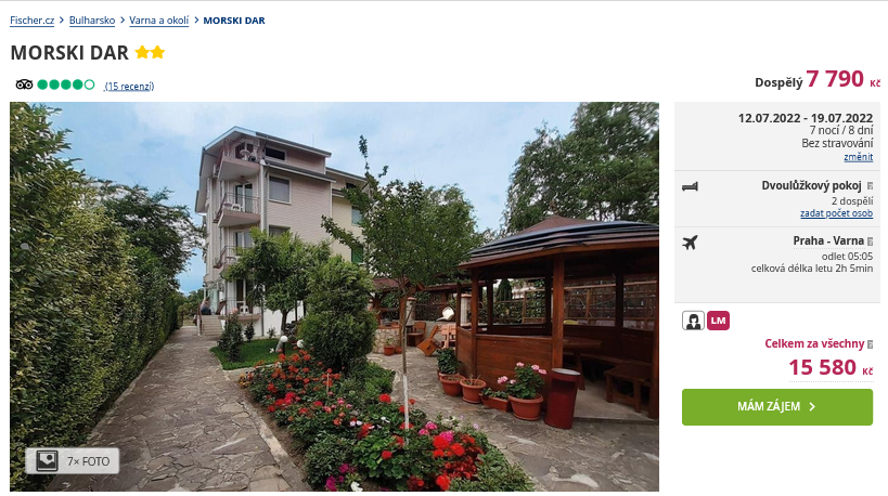 Hledáte dovolenou na klidném místě, kde si budete moci vše zorganizovat podle sebe? Dnes vám přinášíme tip na zájezd s cestovní kanceláří do Bulharska, na který můžete vyrazit již za dva dny. Cena pobytu je 7 790 Kč a zahrnuje ubytování na 8 dní, zpáteční letenky z Prahy, letištní transfery a služby delegáta. Zájezd je bez stravy, nic vám tak nebude bránit v poznávání destinace. Rady a tipy na výlety najdete v našem online průvodci Bulharskem.