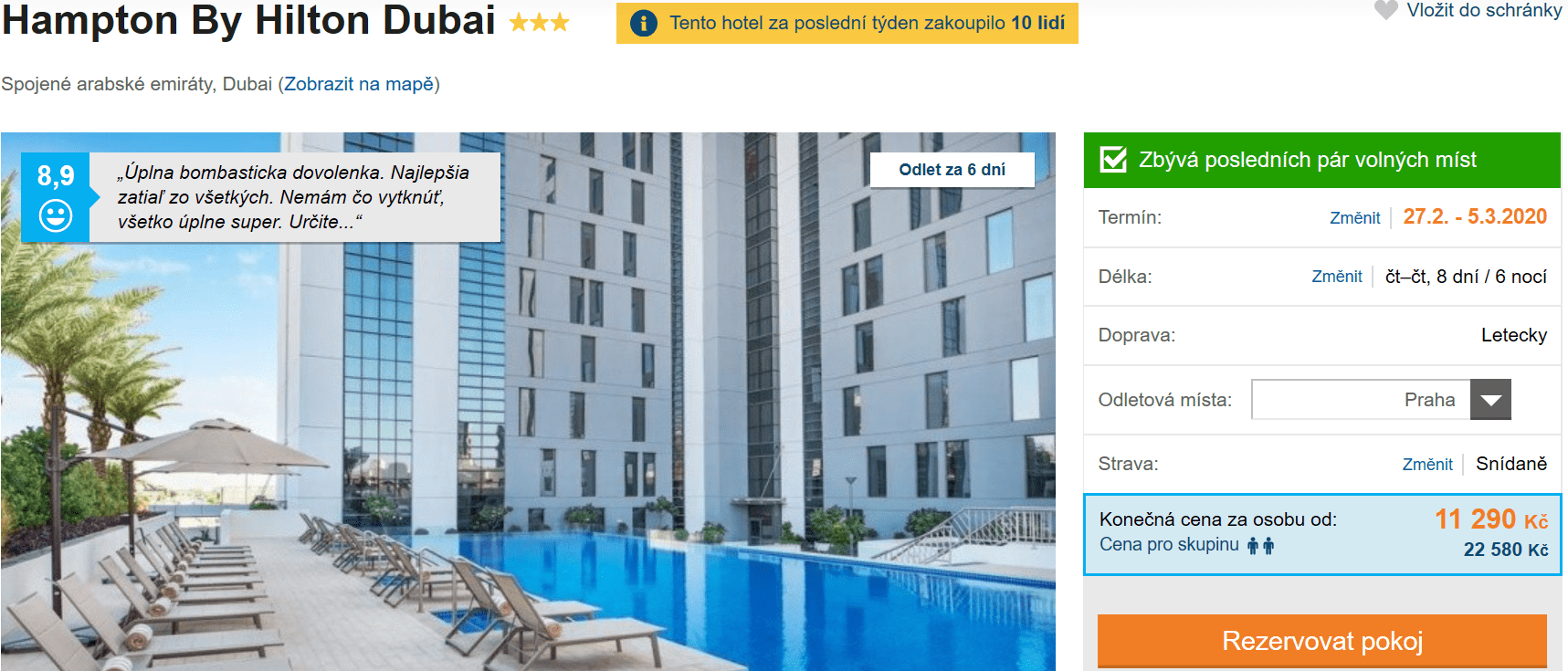 Chcete zažít luxusní Dubaj na vlastní kůži? Pak neváhejte ani minutu a využijte akční nabídky cestovní kanceláře, která vás do tohoto překrásného města zavedete již za skvělých 11 290 Kč! V této ceně máte zpáteční letenku z Prahy, dopravu na místě, služby delegáta, ubytování ve výborně hodnoceném hotelu (na Invii získal hodnocení 8,9/10) a snídaně po dobu 8 dní. I přes to, že je odlet až za šest dní, zájezd je téměř vyprodaný, proto s rezervací určitě neotálejte!