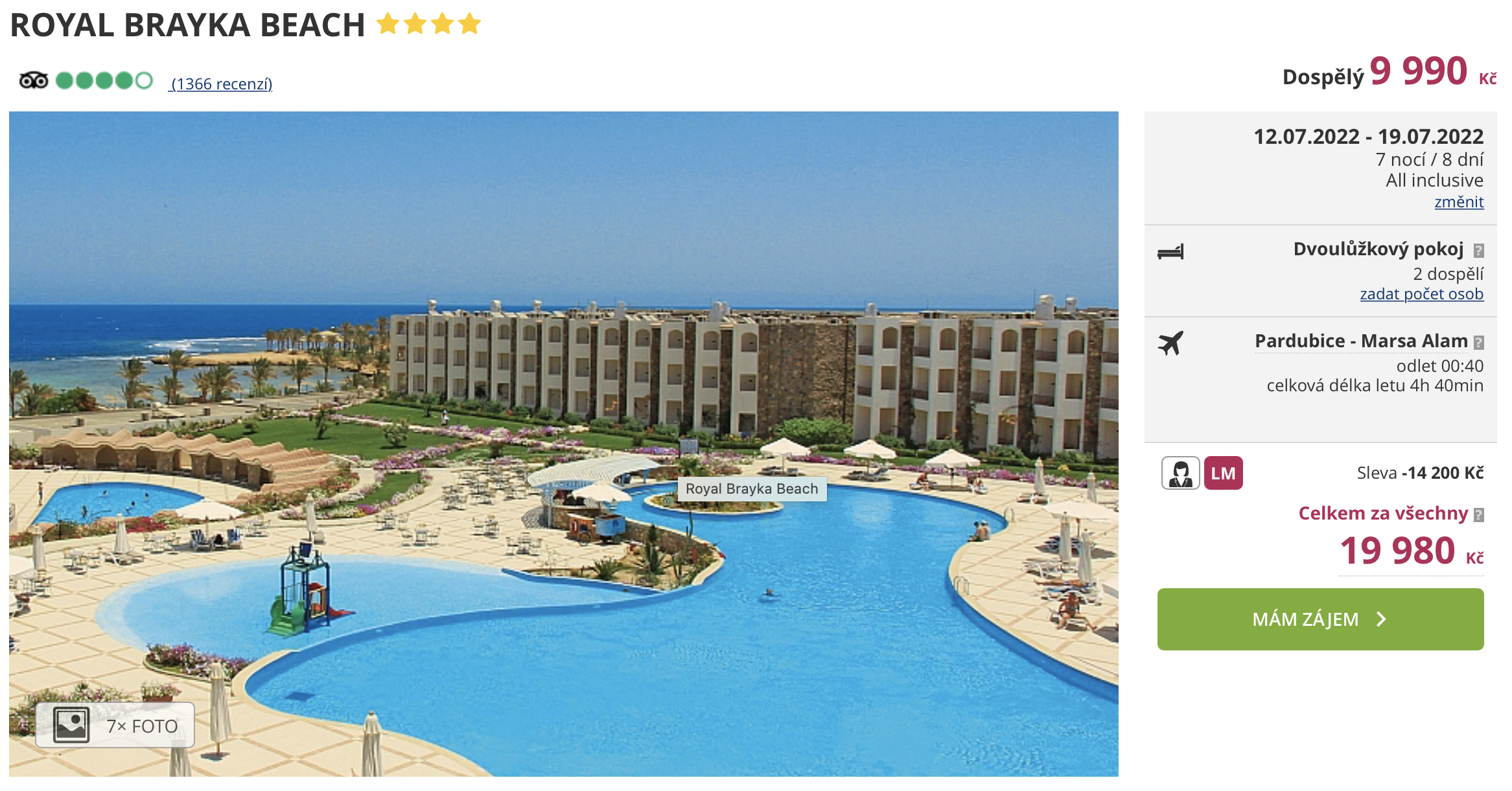 Inspirujte se naším dnešním tipem a navštivte egyptské letovisko Marsa Alam. Dovolenou ve 4* resortu Royal Brayka Beach můžete aktuálně rezervovat za cenu 9 990 Kč na osobu. V této ceně jsou zahrnuty letenky (odlet z Pardubic), letištní transfery v místě, ubytování ve 4* hotelu na 7 nocí, stravování all inclusive a služby delegáta. Před cestou nezapomeňte nakouknout do našeho online průvodce Egyptem, ve kterém najdete informace o jednotlivých letoviscích a tipy na výlety.