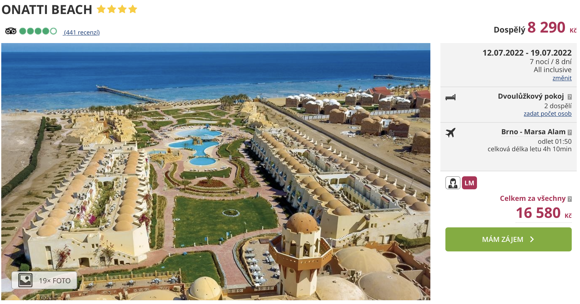 Díky našemu dalšímu dnešnímu tipu můžete zamířit za příznivou cenu do Egypta! Dovolenou v letovisku Marsa Alam můžete aktuálně pořídit za cenu 8 290 Kč. V ceně jsou započítány letenky, letištní transfery v místě, ubytování ve 4* hotelu na 7 nocí, all inclusive stravování a služby delegáta. Letenky jsou dostupné s odletem z Prahy, Brna nebo Pardubic a záleží tak jenom na vás, které z letišť máte v dosahu. Hotel se nachází přímo u pláže a je nově zrekonstruovaný. Před cestou nezapomeňte nakouknout do našeho online průvodce Egyptem, ve kterém najdete tipy na výlety a informace o jednotlivých letoviscích.