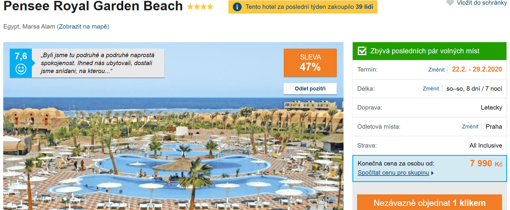 Hledáte dovolenou na last minute a rádi byste odletěli co nejdříve? Pak si nenechte ujít akční nabídku cestovní kanceláře, se kterou se již tuto sobotu můžete vydat do slunného Egypta. Za cenu 7990 Kč si užijete 8-denní dovolenou, v níž máte zahrnuty zpáteční letenku z Prahy, služby delegáta, dopravu na místě, ubytování ve 4* hotelu v Marsa Alam a stravování formou All Inclusive. Více informací o Egyptě se můžete dočíst v tomto podrobném průvodci zdarma. Na zájezdu zbývá posledních pár míst, proto určitě s rezervací neváhejte a hurá balit kufry!