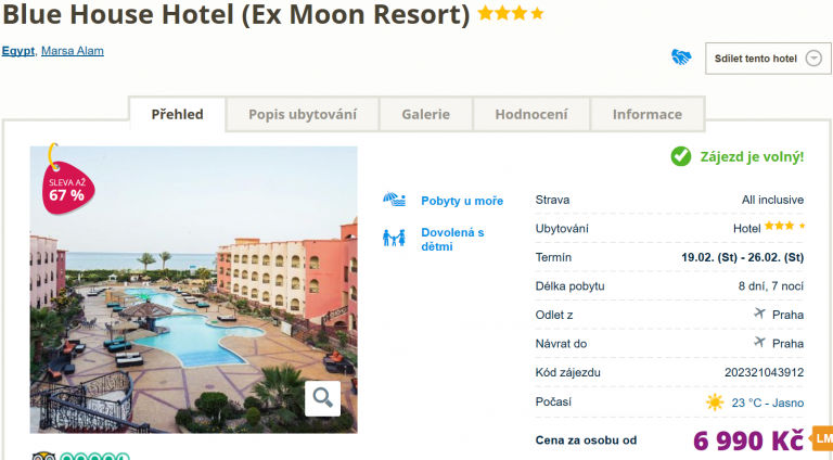 Zpráva pro všechny, kdo hledají zájezd na last minute! Jestliže byste se již zítra rádi vydali směr slunný Egypt, určitě by vám neměla uniknout akční nabídka cestovní kanceláře, v jejíž skvělé ceně 6990 Kč máte zpáteční letenku z Prahy, dopravu na místě, služby delegáta, ubytování v hotelu v letovisku Marsa Alam a stravování formou All Inclusive. Podrobného průvodce po Egyptě naleznete zde. Odlet je již za pár hodin, proto s rezervací určitě neotálejte!