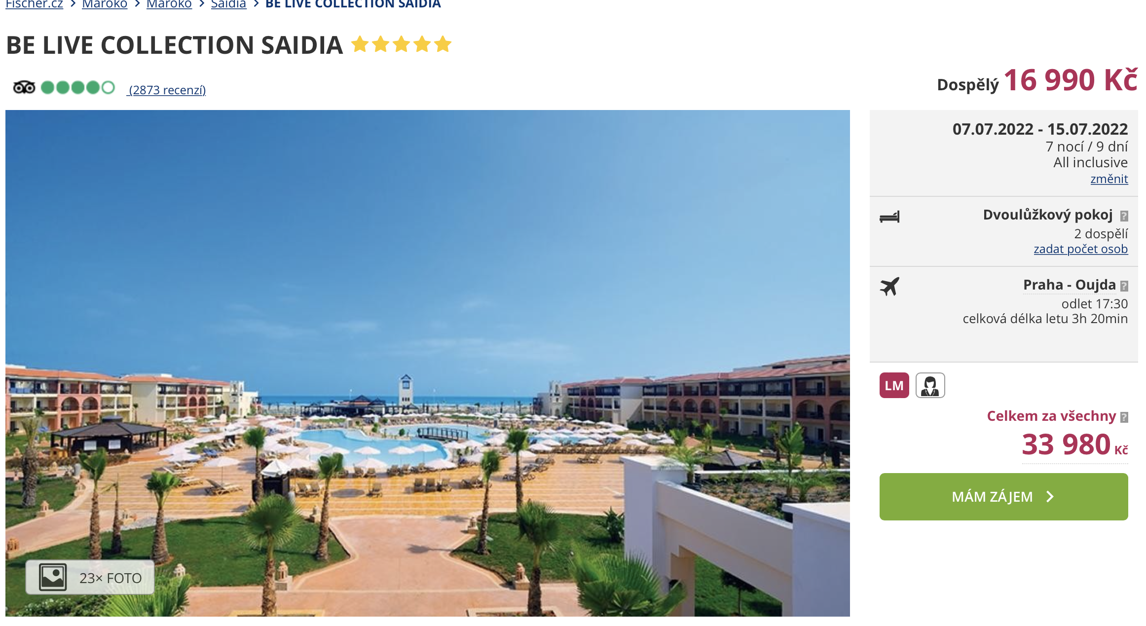 Láká vás návštěva Maroka? Díky našemu dalšímu dnešními tipu si můžete dopřát dovolenou ve skvěle hodnoceném 5* hotelu a letovisku Saidia. Hotel se nachází přímo u pláže a řadí se mezi nejoblíbenější hotely v této oblasti. V ceně zájezdu 16 990 Kč jsou zahrnuty letenky (s odletem z Prahy), letištní transfery v místě, ubytování na 7 nocí, stravování formou all inclusive a služby delegáta.