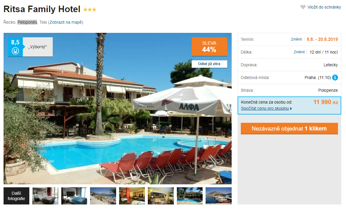 Pokud si potrpíte na kvalitní hotelové služby a krásnou pláž s průzračnou vodou, tak vaše hledání dovolené je právě u konce. Tento zájezd, který je zlevněný o 44 %, vás vezme na dvanáct dní do krásného letoviska Tolo. Ubytováni budete ve výborně hodnoceném hotelu, který  je jen necelých 100 metrů od písečné pláže. Ta se postupně svažuje až to příjemně teplé a křišťálově čisté vody. Navíc si můžete zdarma zapůjčit slunečník. Za částku 11 990 Kč získáte kompletní dovolenou – zpáteční letenky s odletem z Prahy, dopravu z letiště do vašeho hotelu a zpět, služby delegáta, ubytování a stravování. Pokud vás tento zájezd zaujal, tak příliš dlouho neotálejte, místa rychle mizí!