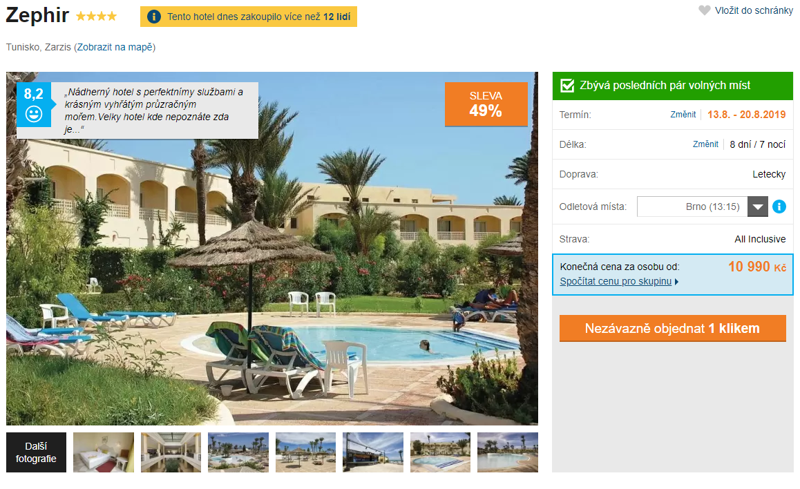 Neváhejte a využijte tohoto výrazně zlevněného zájezdu, který vás vezme do exotického Tuniska. Ubytováni budete ve velmi dobře hodnoceném hotelu, jehož součástí jsou i lázně. Nachází se hned na okraji nádherné a prostorné pláže, kterou porývá světlý písek a která se postupně svažuje až do průzračně čisté vody. Za částku 10 990 Kč získáte kompletní dovolenou – zpáteční letenky s odletem z Prahy či Brna, dopravu z letiště do vašeho hotelu a zpět, služby delegáta, ubytování a stravování formou all inclusive. Pokud vás tento zájezd zaujal, tak příliš dlouho neotálejte, místa rychle mizí!