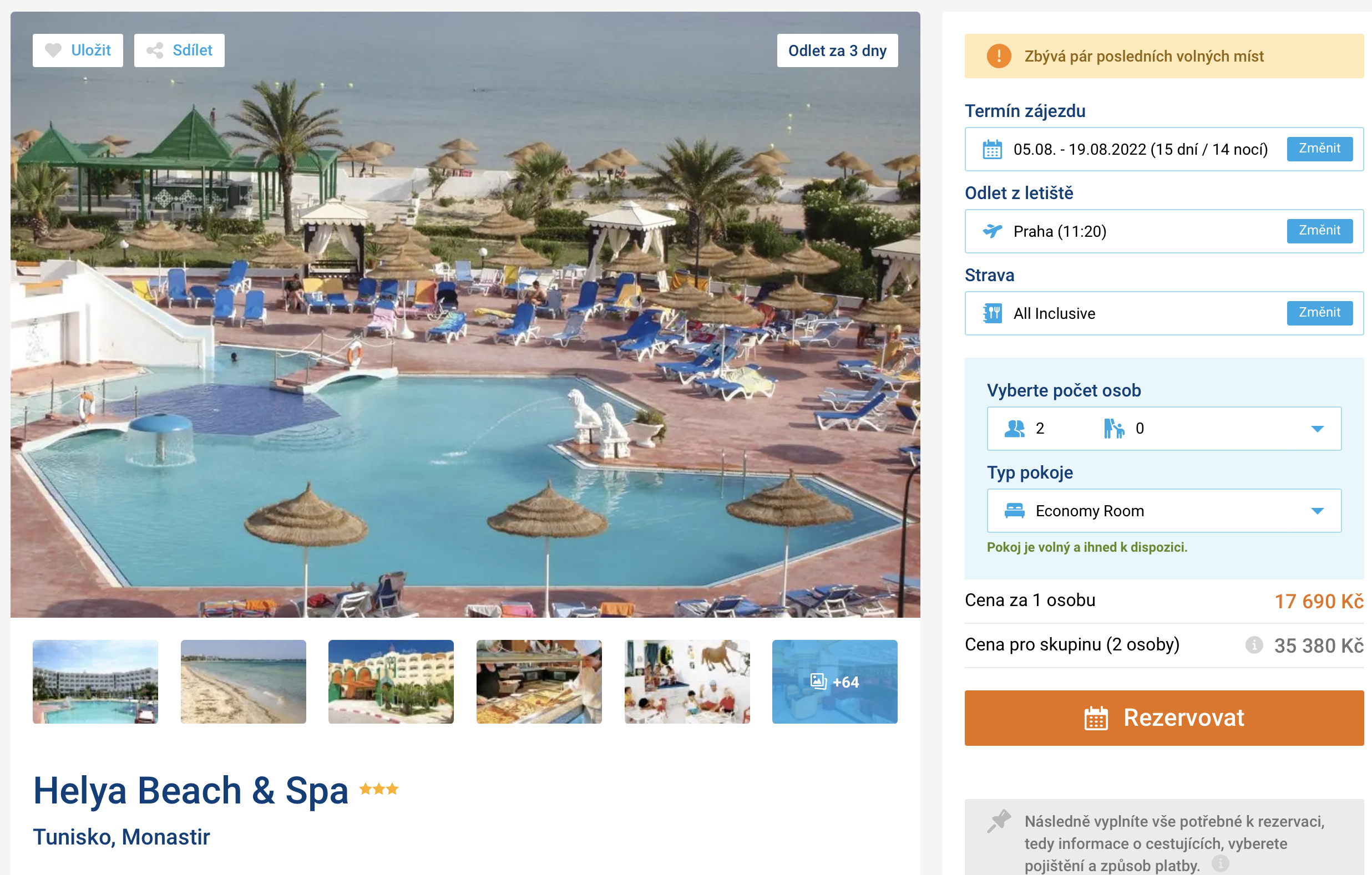 Dopřejte si 15denní dovolenou v letovisku Monastir! Zájezd za cenu 17 690 zahrnuje letenky (s odletem z Prahy), letištní transfery v místě, ubytování na 14 nocí, stravování formou all inclusive a služby delegáta. Hotel Helya Beach & Spa se nachází 5 kilometrů od centra Monastiru. Přímo u hotelu je písečná pláž, na které můžete zdarma využívat lehátka a slunečníky. Pokud se rozhodnete nabídku využít, do Tuniska se podíváte v termínu 5.8. – 19.8. 2022.