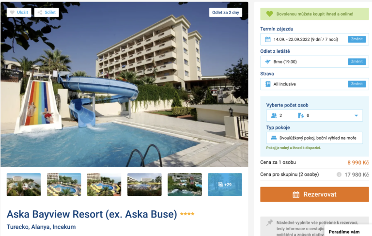 Vydejte se do slunného Turecka načerpat sluníčka a pohodu. Zájezd do 4* hotelu můžete aktuálně pořídit za cenu 8 990 Kč. Tato cena zahrnuje letenky (odlet z Brna), letištní transfery v místě, ubytování na 7 nocí, stravování formou all inclusive a služby delegáta. Hotel Aska Bayview Resort je situován nedaleko krásné pláže Incekum a nabízí několik bazenů, skluzavku a dvě sluneční terasy. Před cestou se určitě inspirujte v našem online průvodci Tureckem, ve kterém najdete tipy na výlety a informace o zemi.