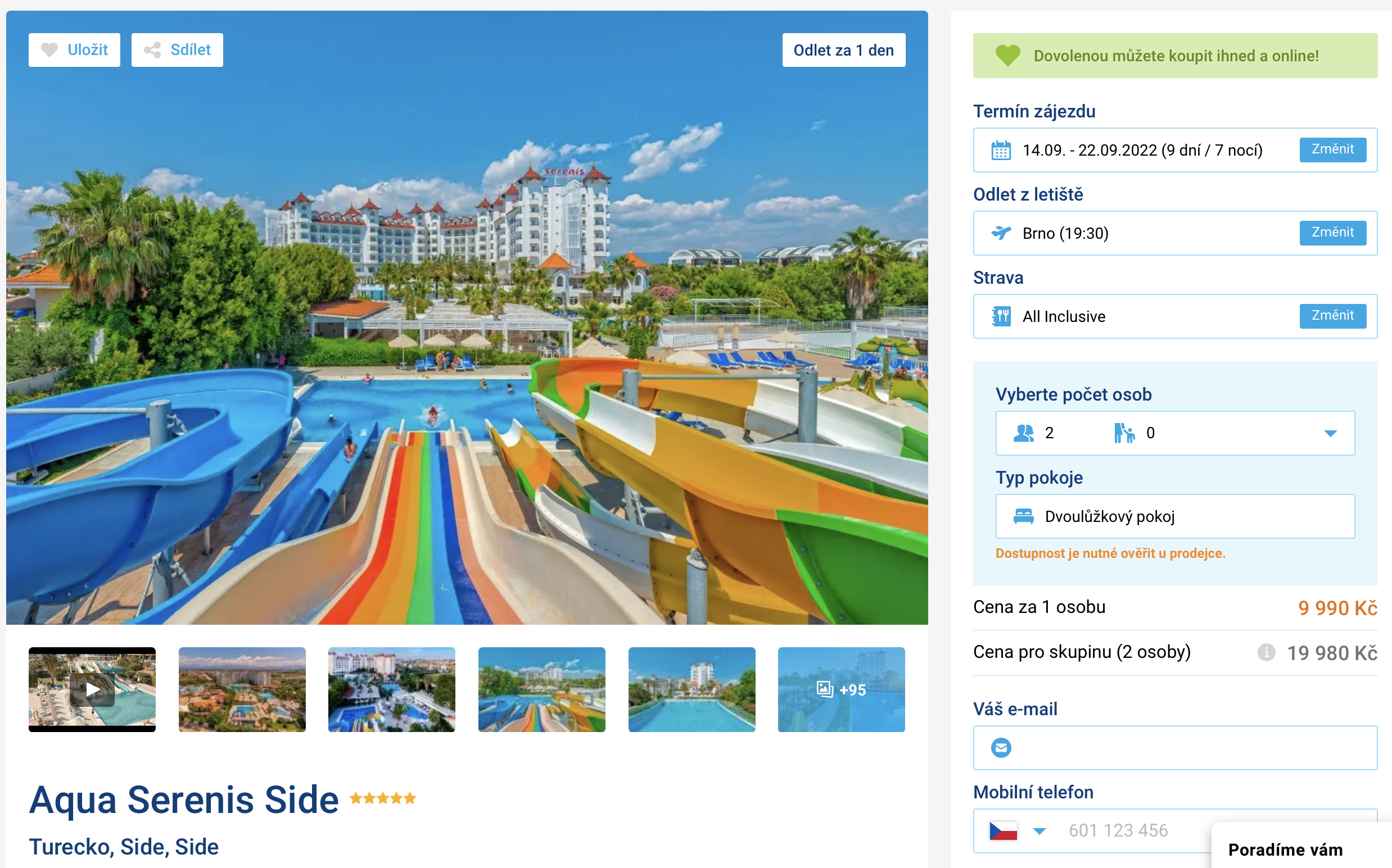 Už zítra můžete relaxovat v 5* hotelu nedaleko tureckého letoviska Side. Zájezd do výborně hodnoceného hotelu aktuálně pořídíte za last minute cenu 9 990 Kč. Tato cena zahrnuje letenky (odlet zítra z Brna), letištní transfery v místě, ubytování na 7 nocí, stravování formou all inclusive a služby delegáta. Hotel se nachází asi 500 metrů od pláže, na kterou vás zdarma zaveze hotelový shuttle. Před cestou se určitě inspirujte v našem online průvodci Tureckem, ve kterém najdete tipy na výlety a informace o zemi.