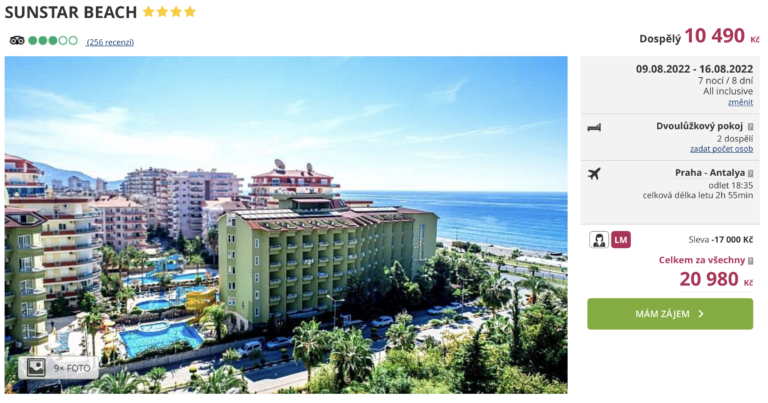 Inspirujte se naším dalším dnešním tipem a dopřejte si skvělou dovolenou v Turecku! Dovolenou v hotelu Sunstar Beach, nedaleko tureckého letoviska Alanya, můžete aktuálně pořídit za cenu 10 490 Kč. V ceně jsou zahrnuty letenky (odlet z Prahy), letištní transfery v místě, ubytování na 7 nocí, stravování formou all inclusive a služby delegáta. Hotel se nachází nedaleko písčité pláže v letovisku Mahmutlar. Před cestou se nezapomeňte inspirovat v našem online průvodci Tureckem, ve kterém najdete tipy na výlety a informace o jednotlivých letoviscích.
