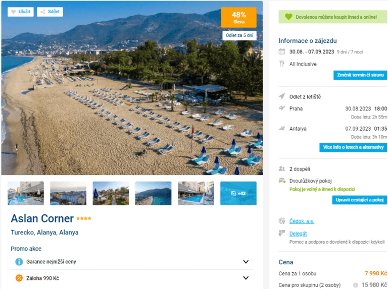Náš další tip na levnou dovolenou směřuje do Turecka – za cenu 7990 Kč se tam podíváte se vším všudy (letenky, delegát, letištní doprava a ubytování na týden s All Inclusive). Hotel se nachází v živém letovisku Alanya a jen 250 metrů od oblíbené Kleopatřiny pláže. Před cestou nakoukněte do našeho průvodce Tureckem, kde najdete spoustu tipů pro vaši cestu.