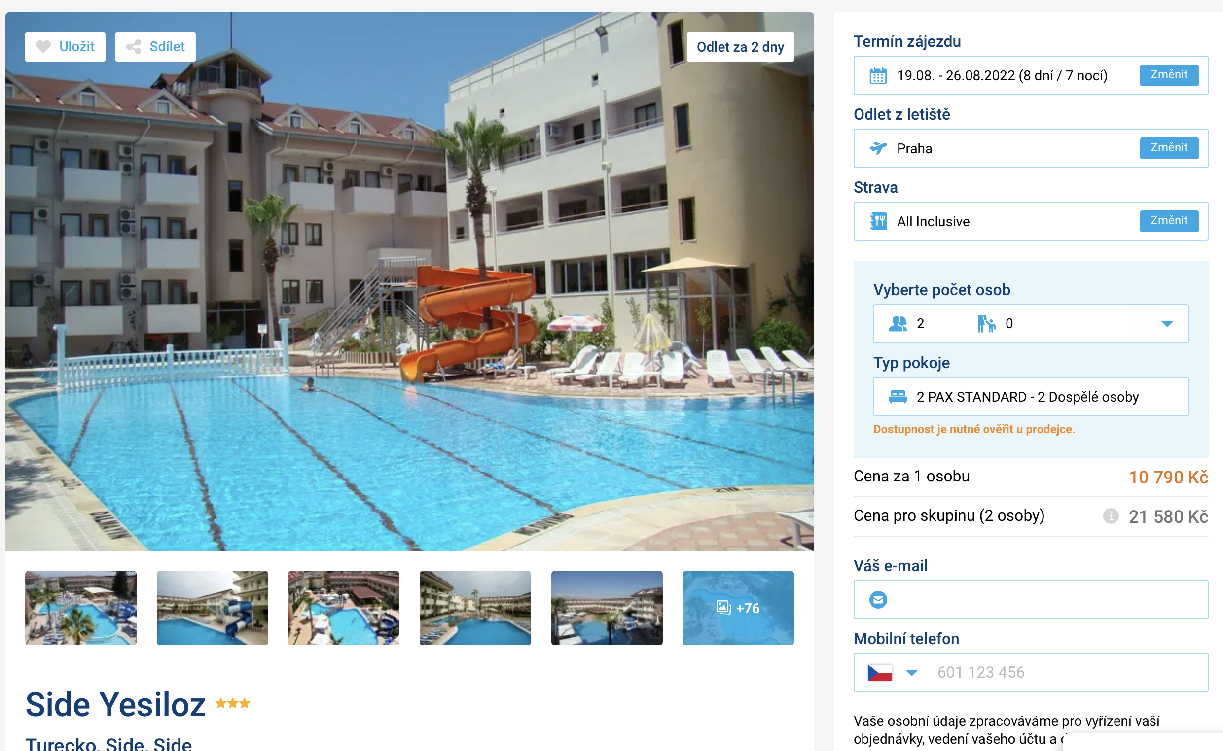 Navštivte turecké letovisko Side a výborně hodnocený hotel Side Yesiloz. Zájezd můžete aktuálně pořídit za cenu 10 790 Kč. V této ceně jsou zahrnuty letenky (odlet z Prahy), letištní transfery v místě, ubytování na 8 dní, all inclusive stravování a služby delegáta. Na písčitou pláž vás zaveze hotelový svoz. Před cestou se inspirujte v našem online průvodci Tureckem, ve kterém najdete tipy na výlety a informace o zemi. Pokud se rozhodnete nabídku využít, do Turecka se podíváte v termínu 19.8. – 26.8. 2022.