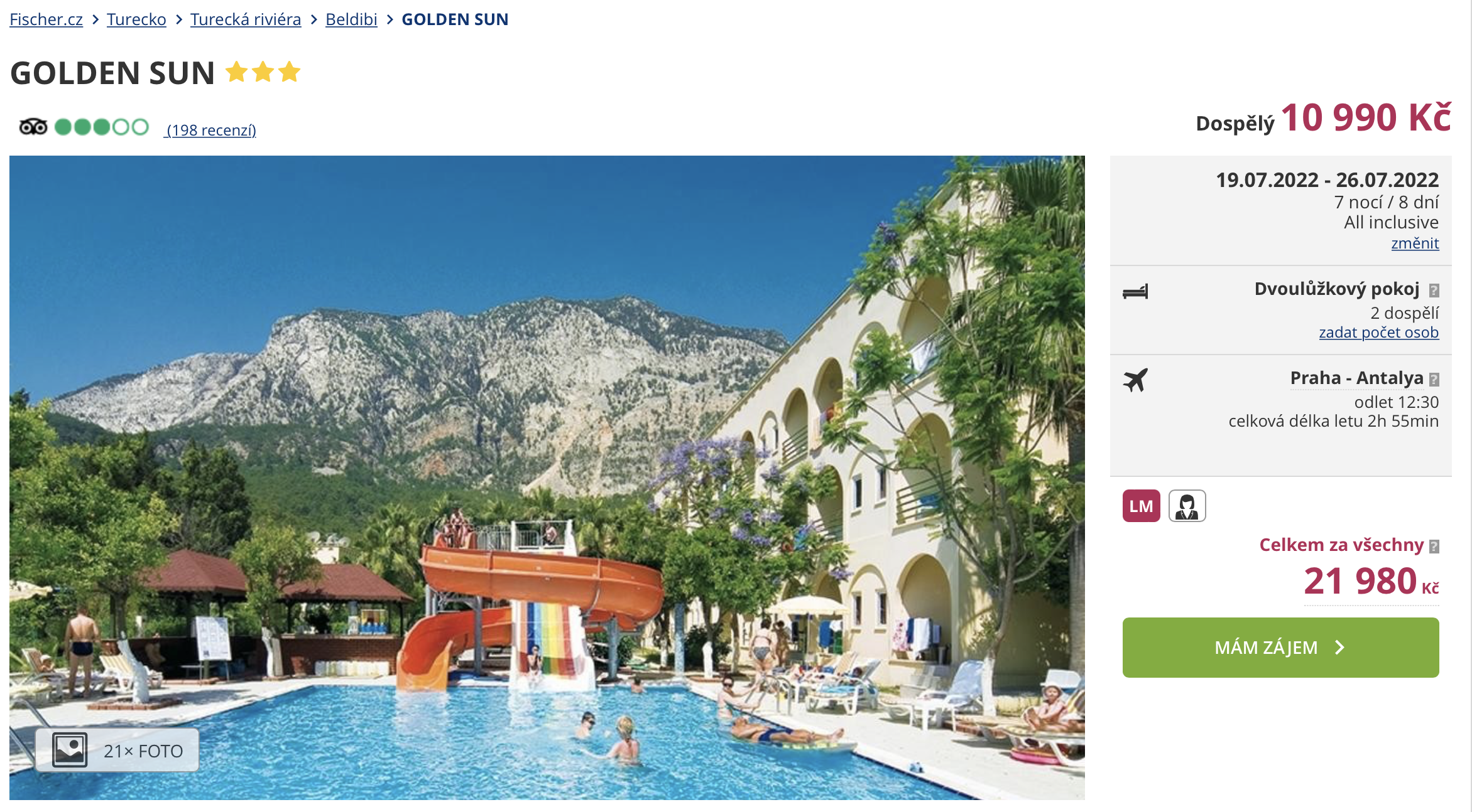 Využijte last minute nabídky a navštivte Turecko! Dovolenou ve 3* hotelu s all inclusive můžete aktuálně pořídit za cenu 10 990 Kč. Hotel se nachází v centru městečka Beldibi, nedaleko pláže, na které můžete zdarma využívat slunečníky. Cena zájezdu zahrnuje letenky (s odletem z Prahy), letištní transfery v místě, ubytování na 7 nocí, all inclusive stravování a služby delegáta. Před cestou se nezapomeňte inspirovat v našem online průvodci Tureckem.